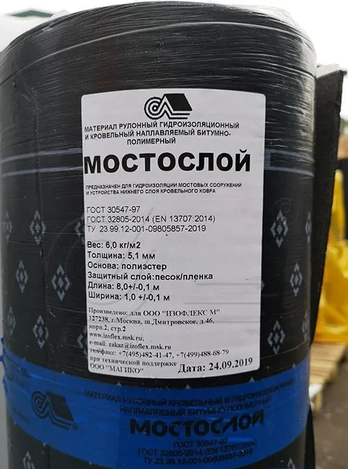 "Мостослой" - битумно-полимерный материал, предназначен для гидроизоляции мостовых сооружений, в т.ч. железобетонной плиты проезжей части, устройства защитно-сцепляющего слоя на стальной ортотропной плите пролетных строений, гидроизоляции других строительных конструкций, а также для устройства нижнего слоя кровельного ковра зданий и сооружений различного назначения, эксплуатируемых во всех климатических районах.