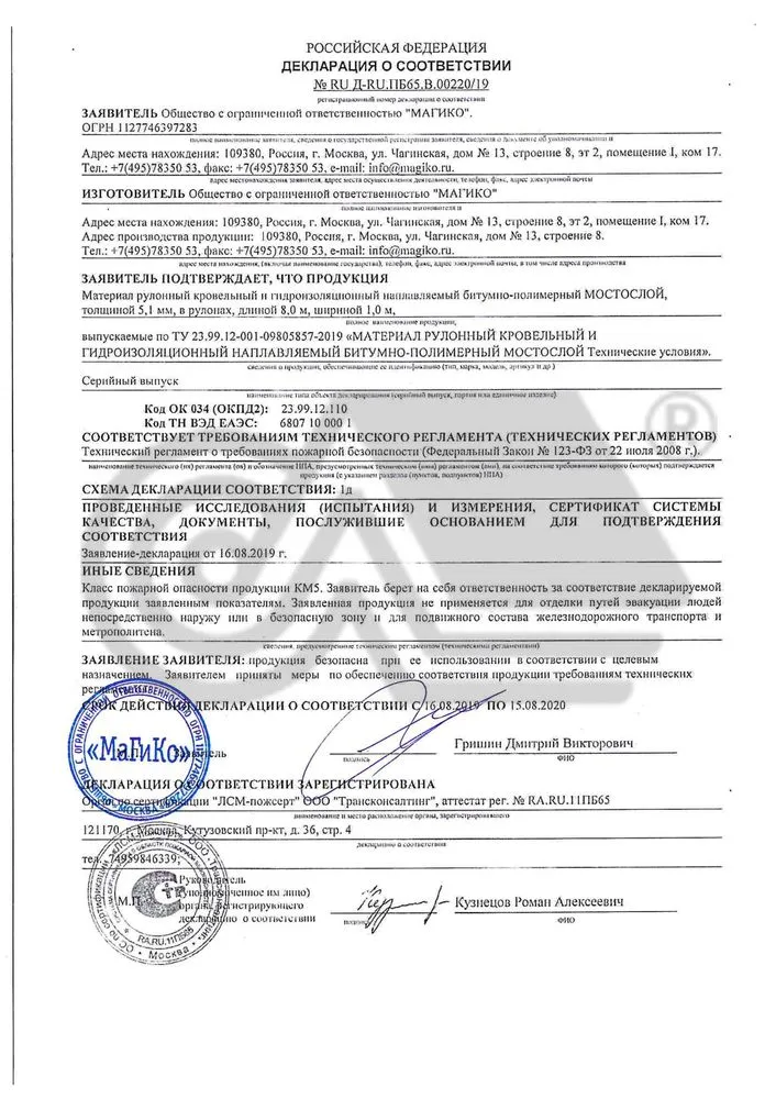 Пожарная декларация о соответствии: № RU Д-RU.ПБ65.В.00220/19.