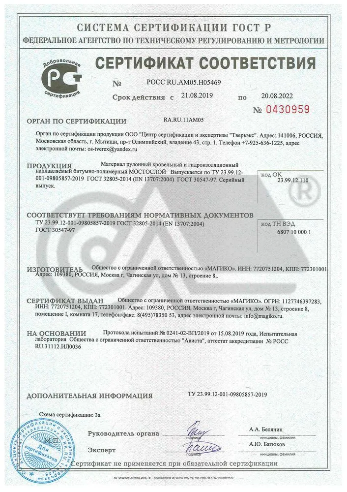 Кровельный материал "Мостослой" соответствует: ТУ 23.99.12-001-09805857-2019 ГОСТ 32805-2014 (EN 13707:2004) ГОСТ 30547-97.